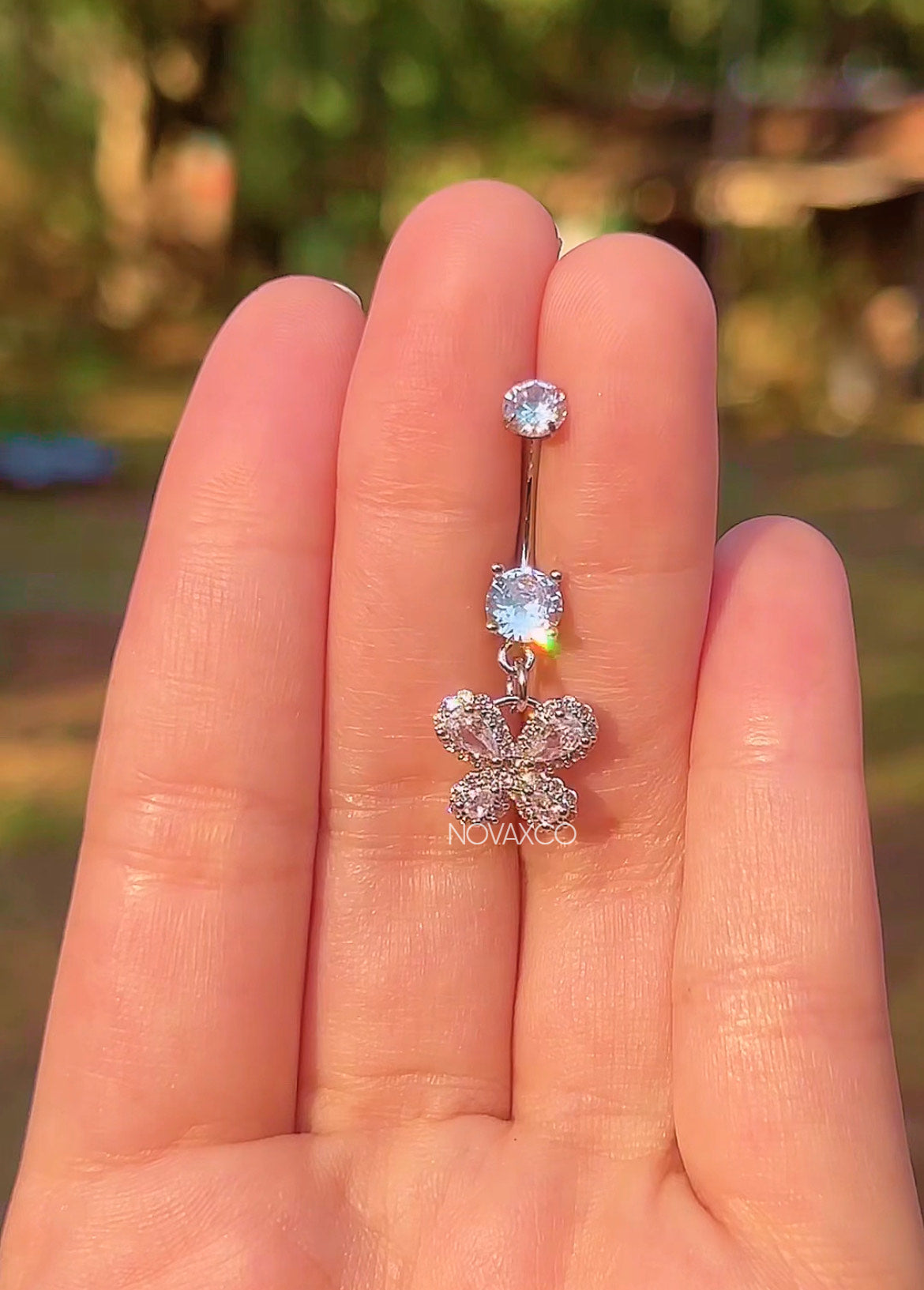 Ethereal butterfly belly button piercing with a dangling butterfly charm. This piece is made from a titanium bar that is internally threaded, perfect for those with more sensitive piercing needs. A beautiful statement piece that is timeless and sparkles so much with the highest quality cubic zirconia.