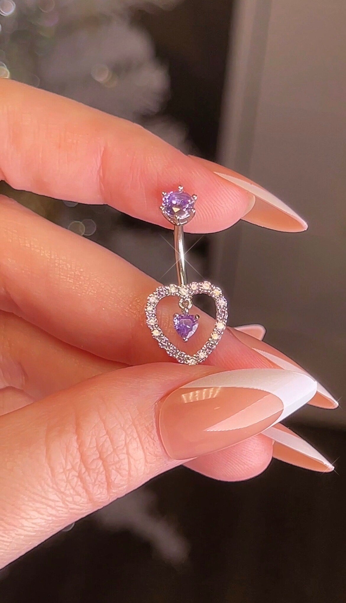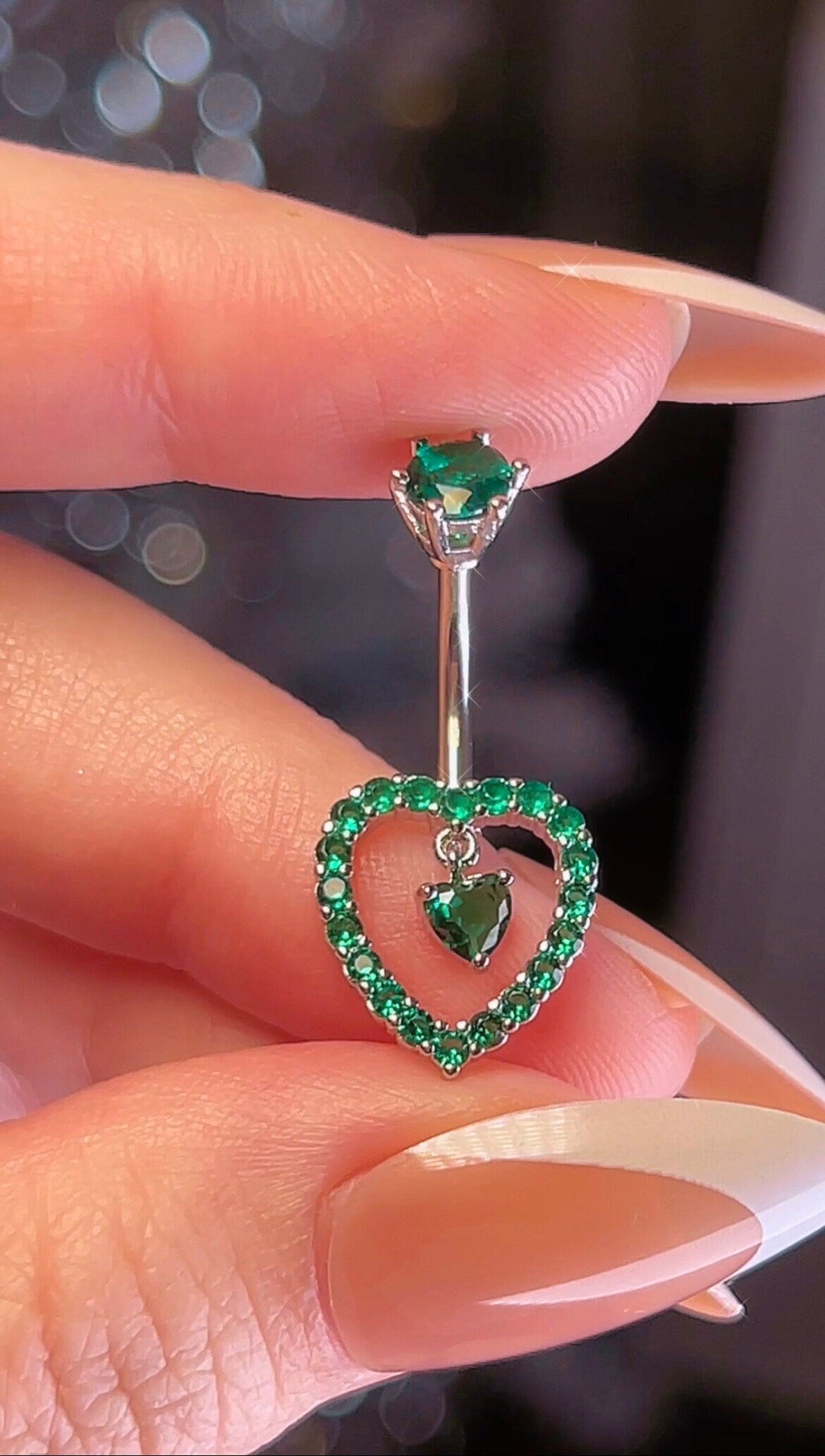 Heart belly button ring with a sparkly top ball, has a tiny dangly heart in the center. The emerald belly ring makes the perfect gift for someone who loves emerald, or for the month of May birthstone.