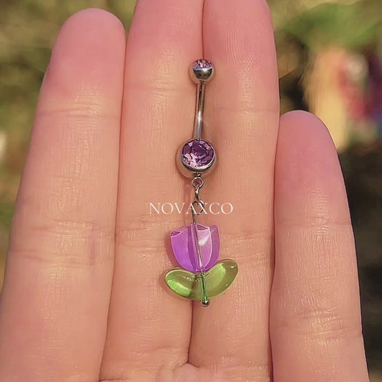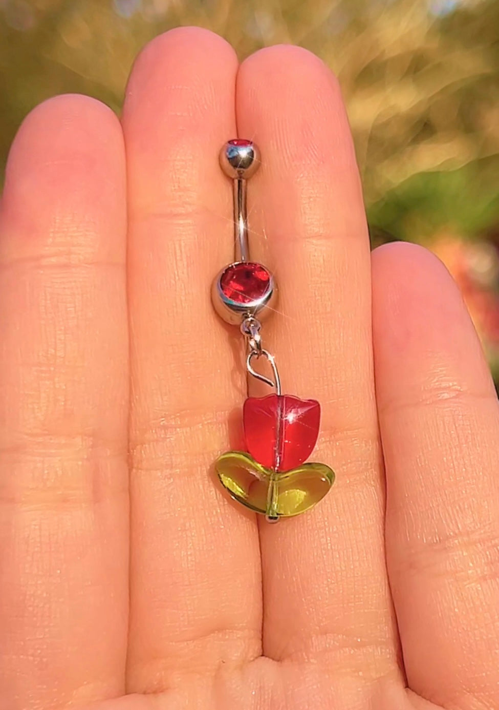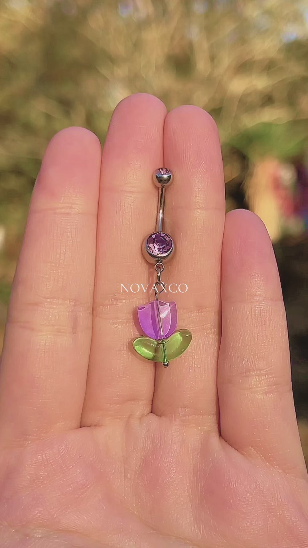 The perfect belly ring for spring and summer time, little flower dangle belly rings. Available in pink, purple, yellow, blue, and red. Each piece is handmade to order!