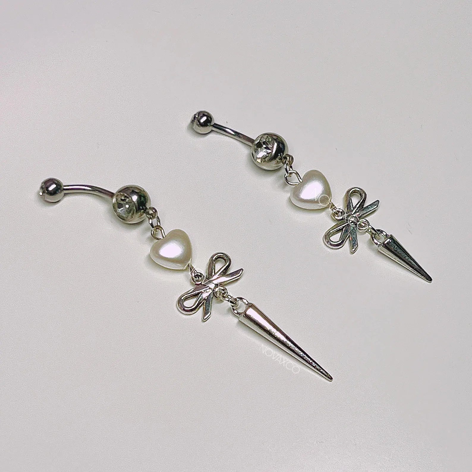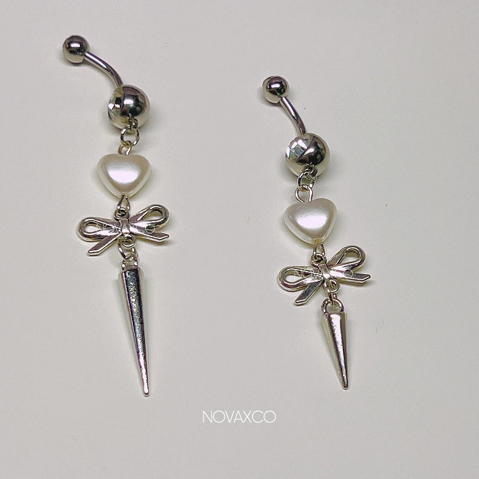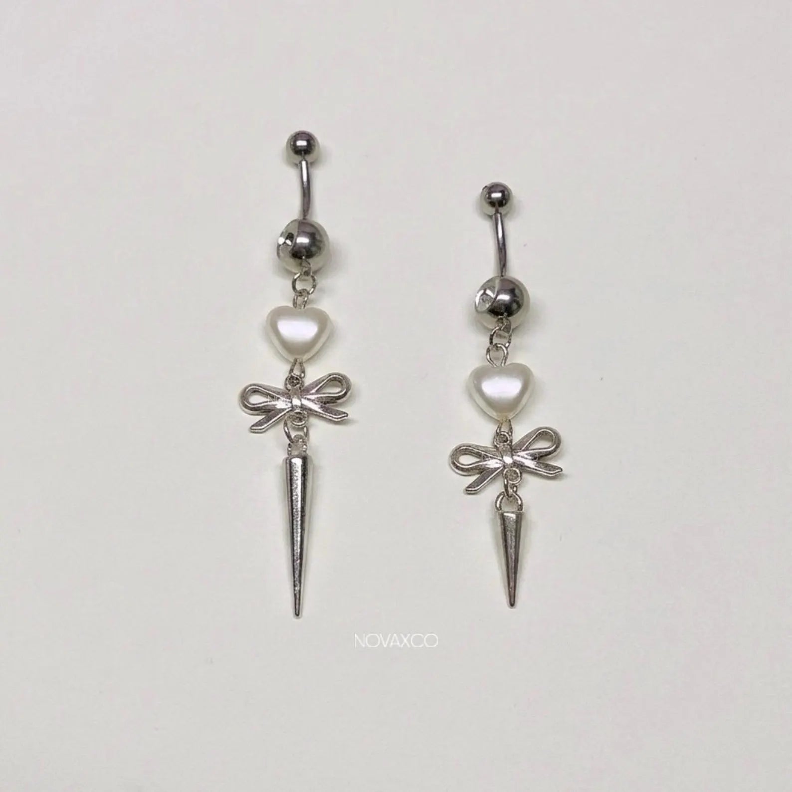 Alternative style belly button ring with a pearl heart and bow with a spike charm accent. The cutest mix of coquette and alt girl~