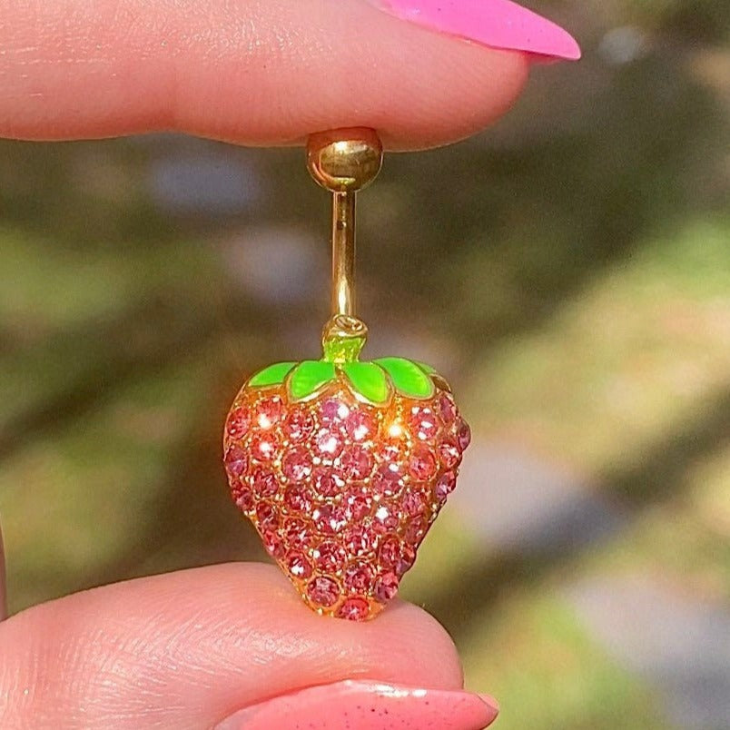 A silver-colored surgical steel belly ring featuring sparkling cubic zirconia jewels with a delicate strawberry.